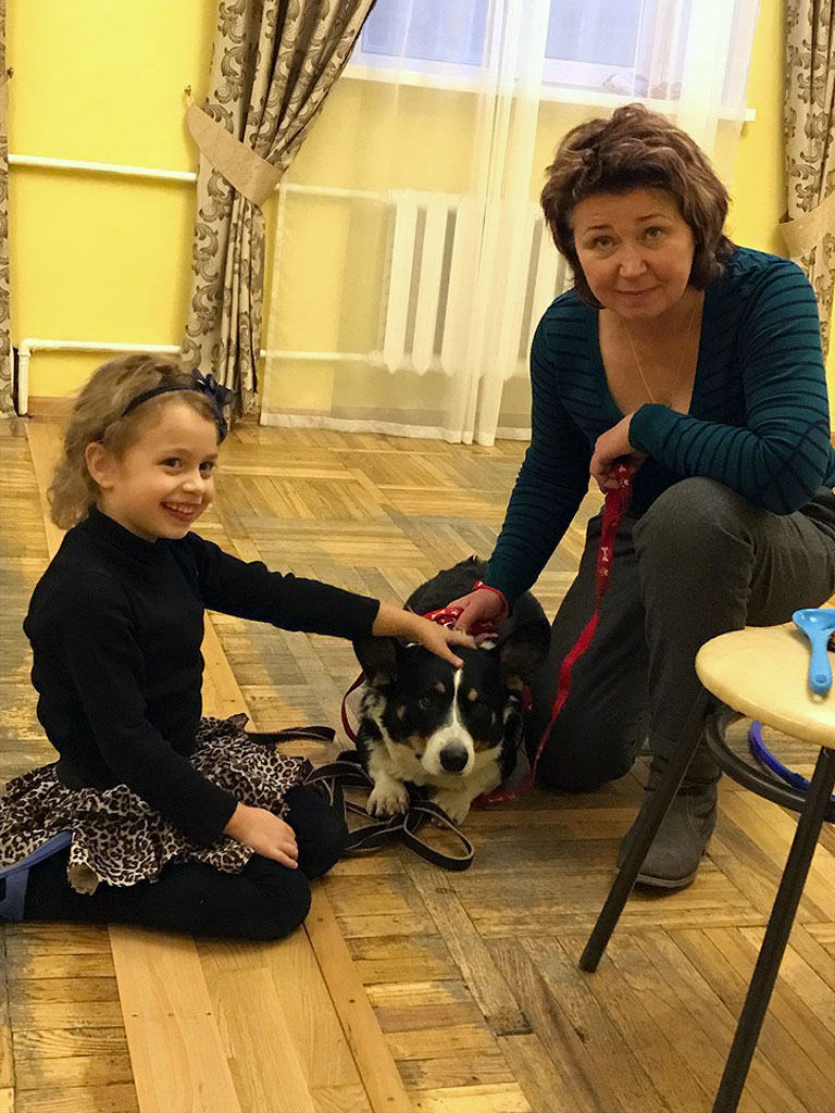 Педагог с собакой породы Вельш-корги Кардиган (уэльская овчарка) в мае сего года прошли специальные курсы и получили допуск к такого рода занятиям.