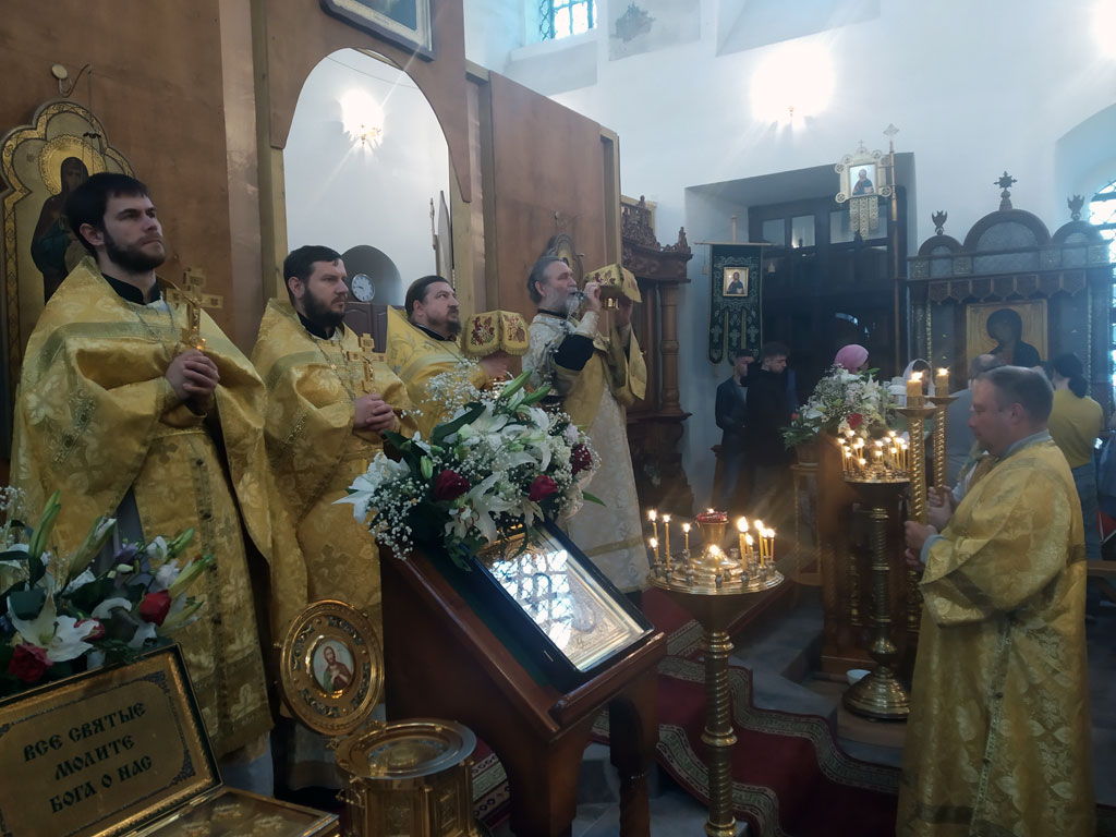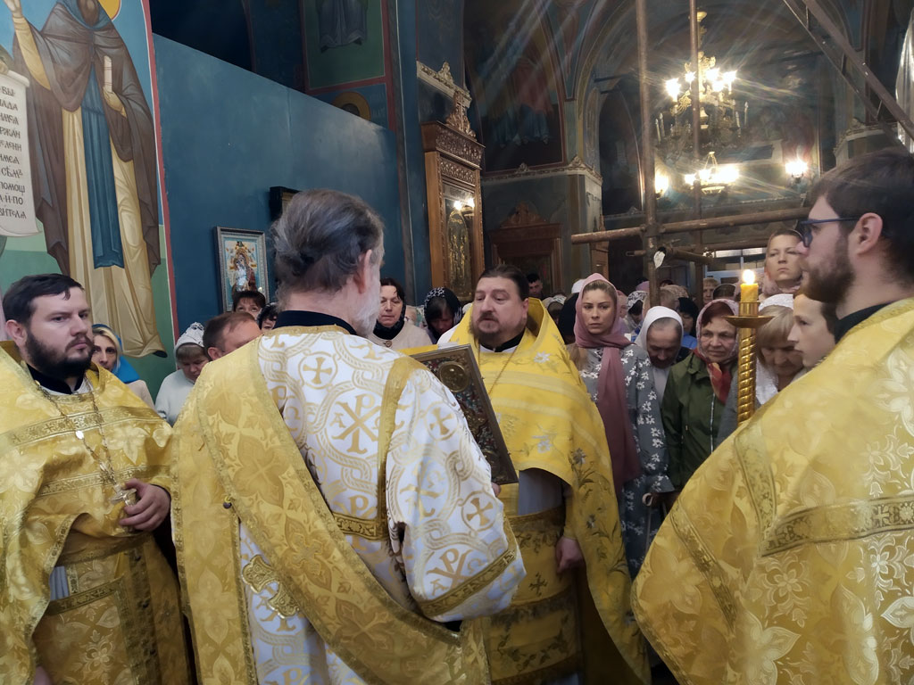 Утром была совершена одна Божественная литургия - предстоял настоятель храма игумен Мефодий (Пронькин) в сослужении иерея Александра Беляева и иерея Павла Степанюка, протодиакона Василия Савельева и диакона Виктора Староста. На сугубой ектении возносились прошения о единстве Церкви, а также была прочитана молитва о мире на Украине.