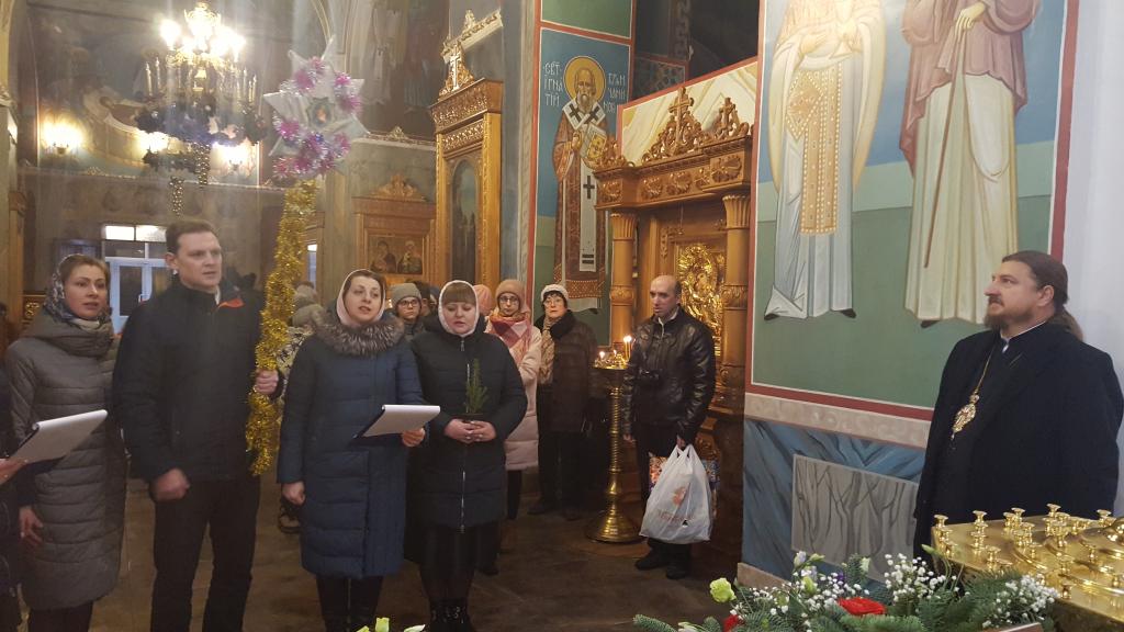 Посетили колядовщики и храм святого пророка Иоанна Предтечи в Калуге, где их встречал настоятель храма игумен Мефодий (Пронькин).
