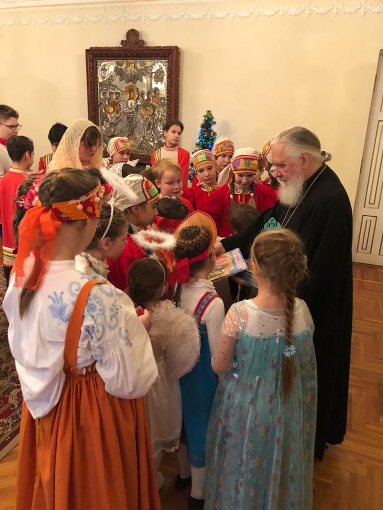 Ребята пели колядки, танцевали, читали стихи, прославляли родившегося Христа, поздравляли Владыку с праздником и одаривали его подарками, как в своё время волхвы несли свои дары, рождённому Христу . Подарки: народная кукла и расписанная чайная пара с ангелами с большой любовью были сделаны мастерами-педагогами Воскресной школы Канивец А.Д. и Рудченко О.А.