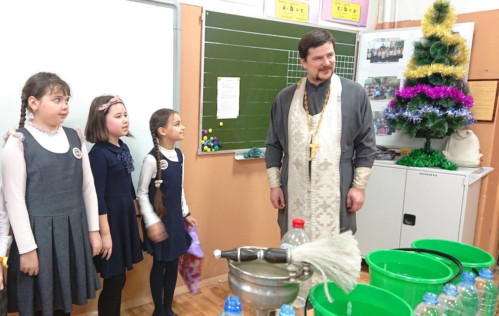 Священник окропил Крещенской святой водой классы школы, пожелавших учащихся и учителей.