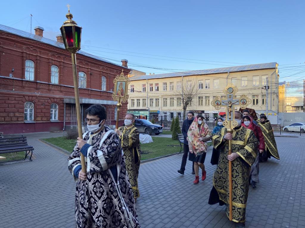На Великом славословии совершается крестный ход вокруг храма с Плащаницей Спасителя, к сожалению, в этом году, из-за угрозы короновируса участвовали в нём только духовенство и хор.