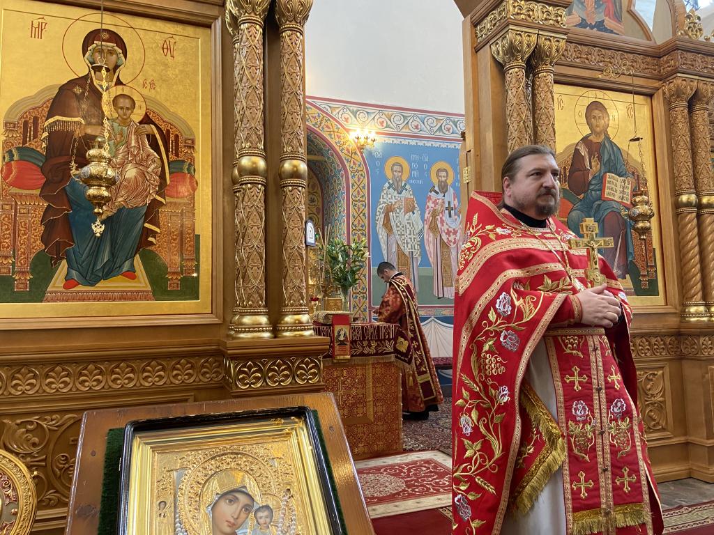 Позднюю литургию совершил настоятель храма, секретарь Калужской епархии, игумен Мефодий (Пронькин) в сослужении иерея Александра Беляева и диакона Виктора Старосты. По сугубой ектении отец настоятель прочитал молитву об избавлении от морового поветрия. По отпусте литургии, по центру храма, был совершен праздничный молебен после чего игумен Мефодий обратился к собравшимся с проповедью.