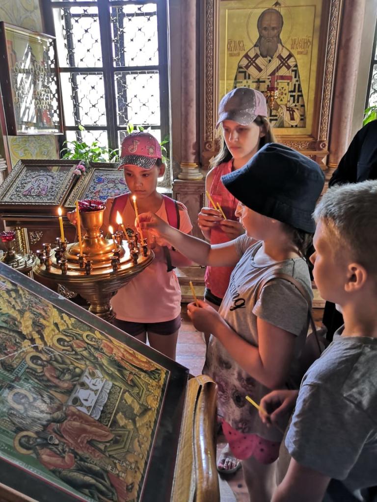 22 июня дети, посещающие летний лагерь социально-реабилитационного центра «Надежда», были приглашены в наш храм. Для них была проведена экскурсия по храму, в ходе которой ребятам рассказали о его истории, о жизни святых, изображенных на иконах и фресках храма, о христианском понимании молитвы и её значении в жизни человека. По окончании экскурсии по уже сложившейся традиции мы объяснили детям христианский обычай возжигания свечей перед иконами и раздали им свечи, которые они смогли поставить о здравии и об упокоении.