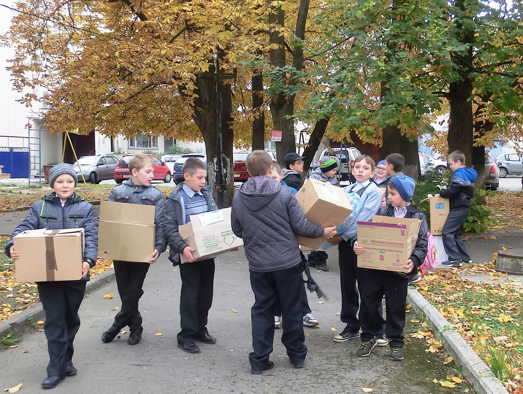 Перед храмом школьники внесли свою лепту в сбор гуманитарной помощи беженцам с Украины.