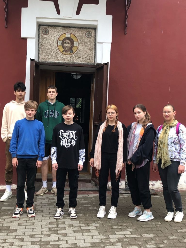 Перед экзаменами Кирилл, Илья, Настя, Антон, София, Руслан, Настя поклонились и приложились к иконе праздника, пропели молитвы перед началом важного дела, испросили благословения у настоятеля Храма - батюшки Мефодия.