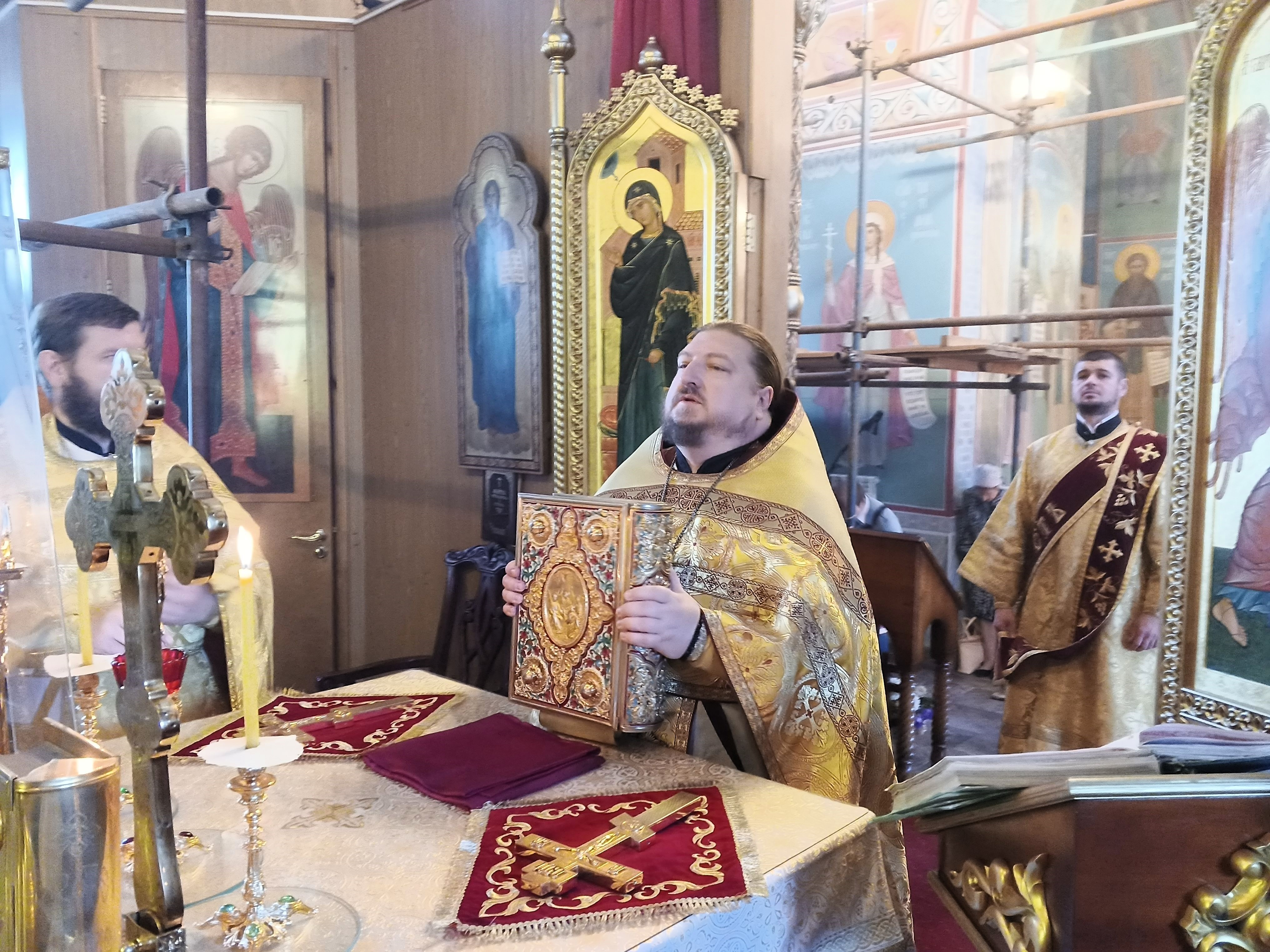 Утром были совершены две Божественные литургии.Раннюю литургию, в южном пределе преподобного Сергия Радонежского, совершил иерей Павел Степанюк, помогал диакон Тимофей Вишняков. Исповедь принимал иерей Александр Беляев.