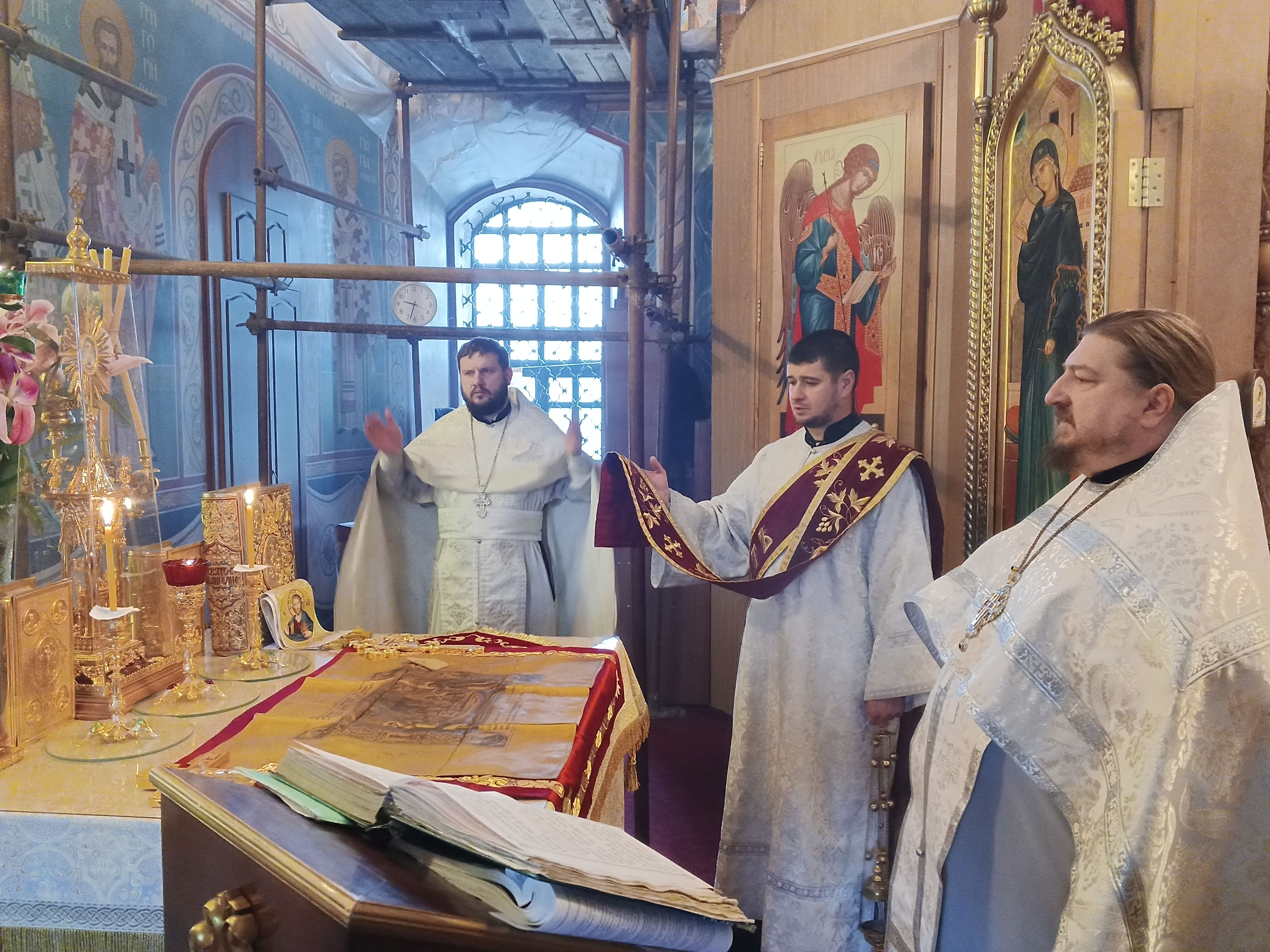 На поздней литургии предстоял игумен Мефодий (Пронькин), настоятель храма, секретарь Калужской епархии, сослужили ему иерей Александр Беляев и диакон Виктор Староста.