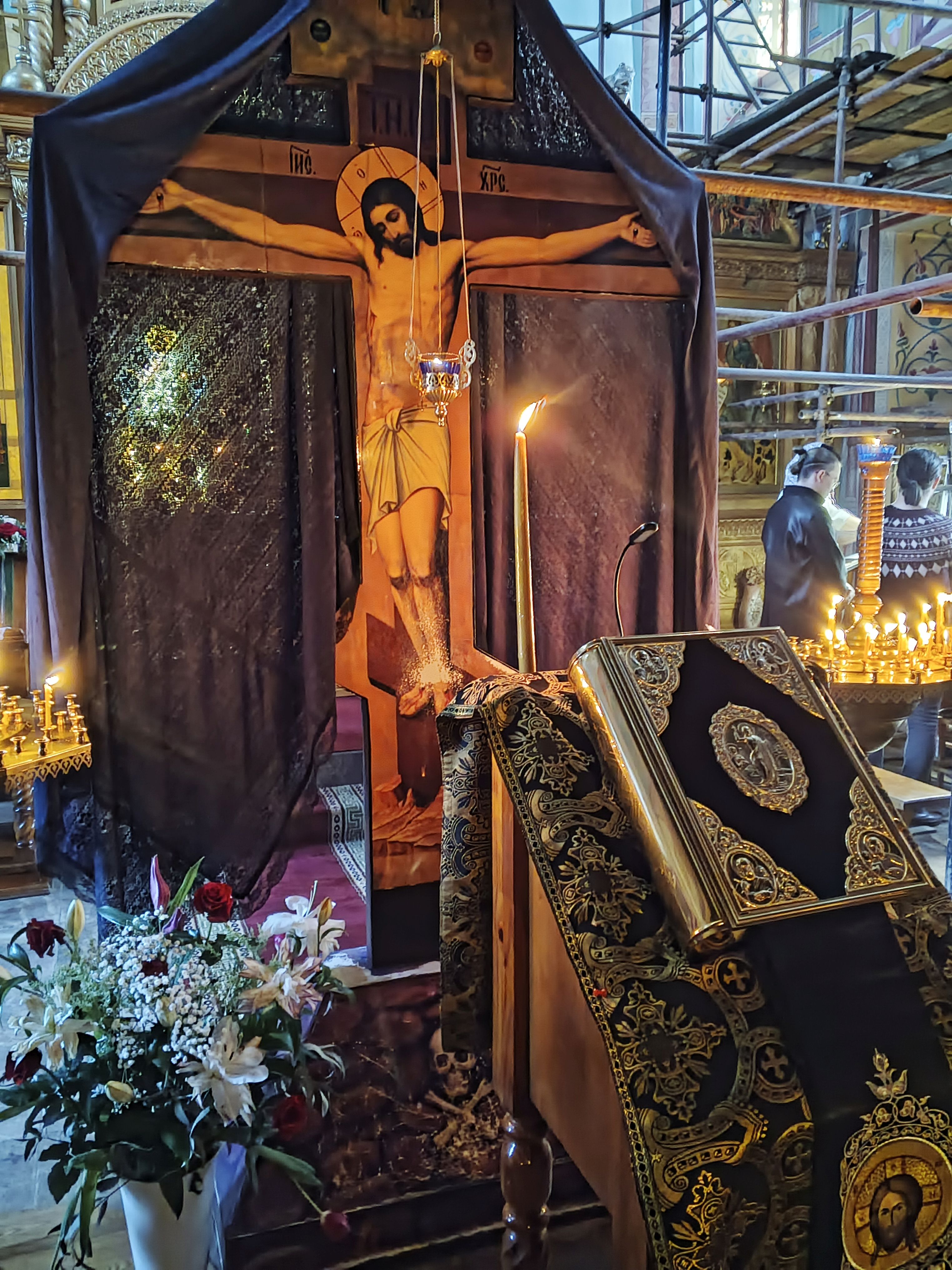 В конце службы все верующие с благоговением подходят поклониться перед Распятием, Крестом Христовым, который на Пассии выносится на середину храма.