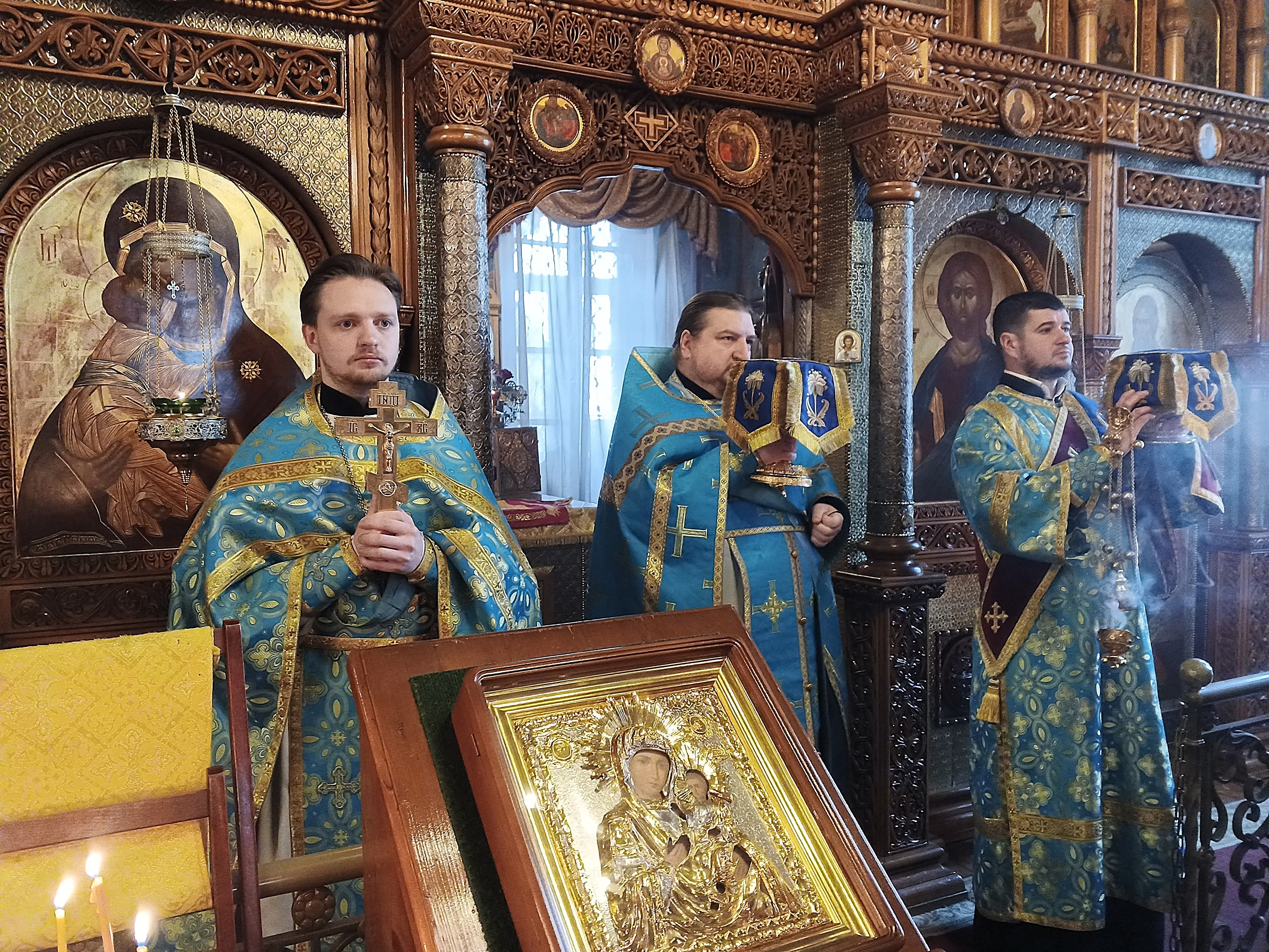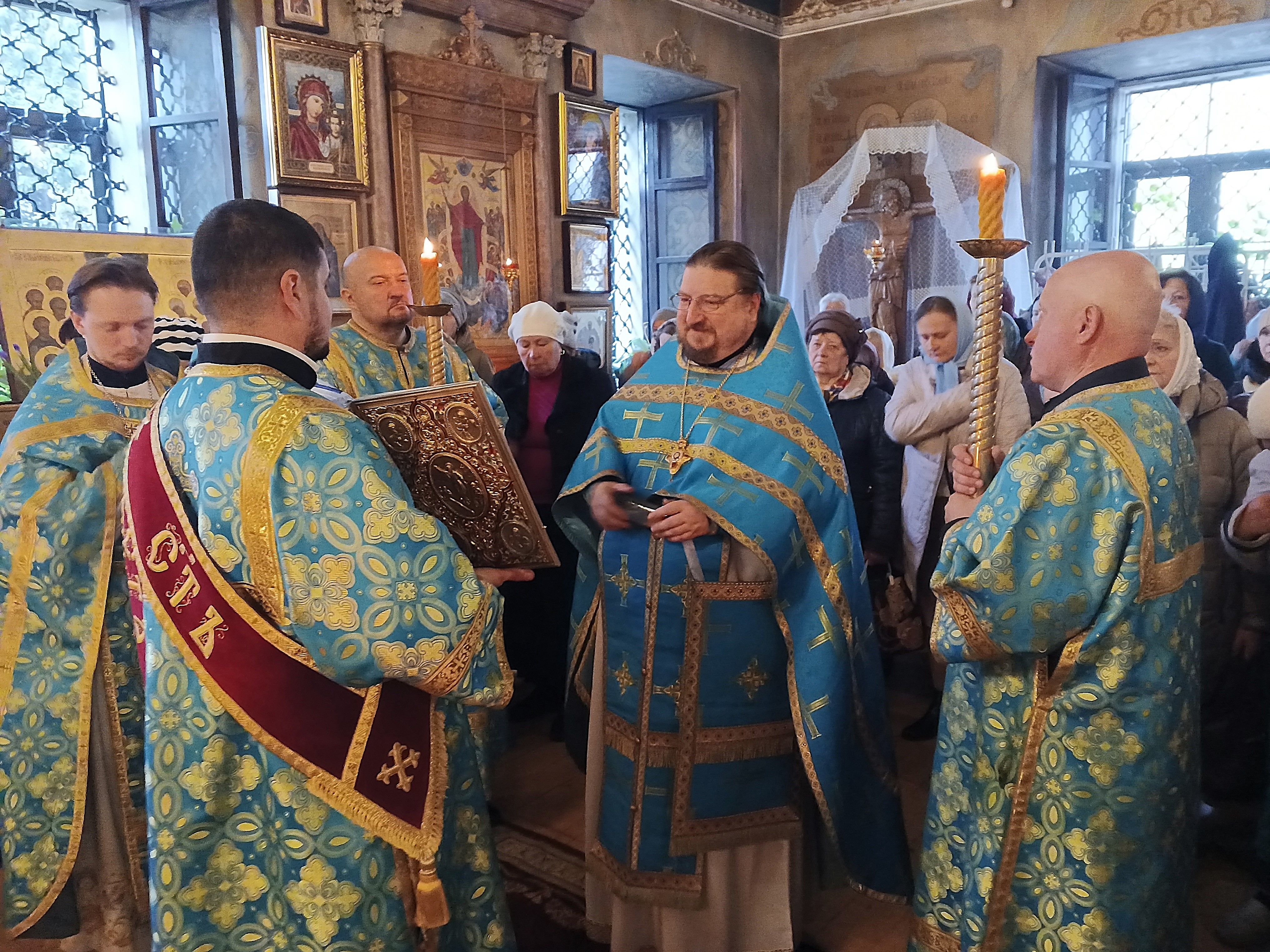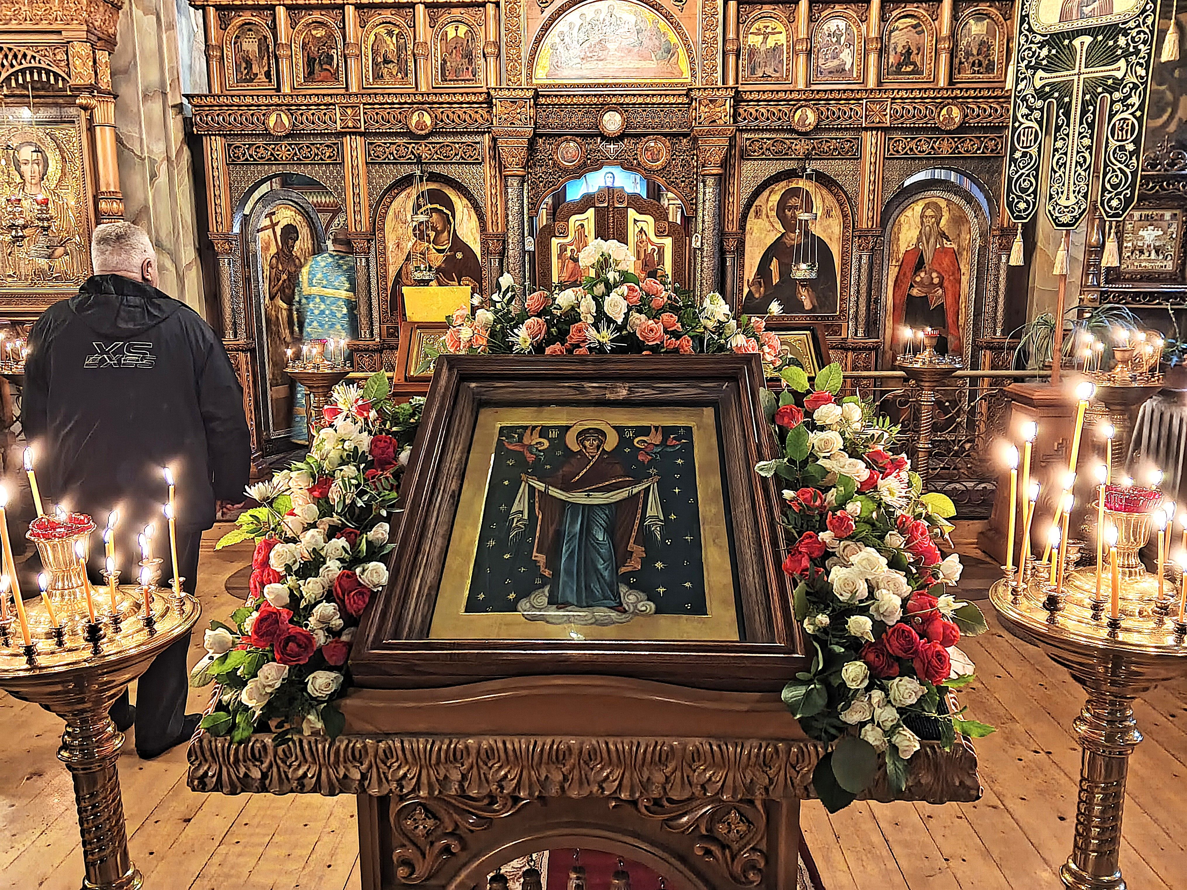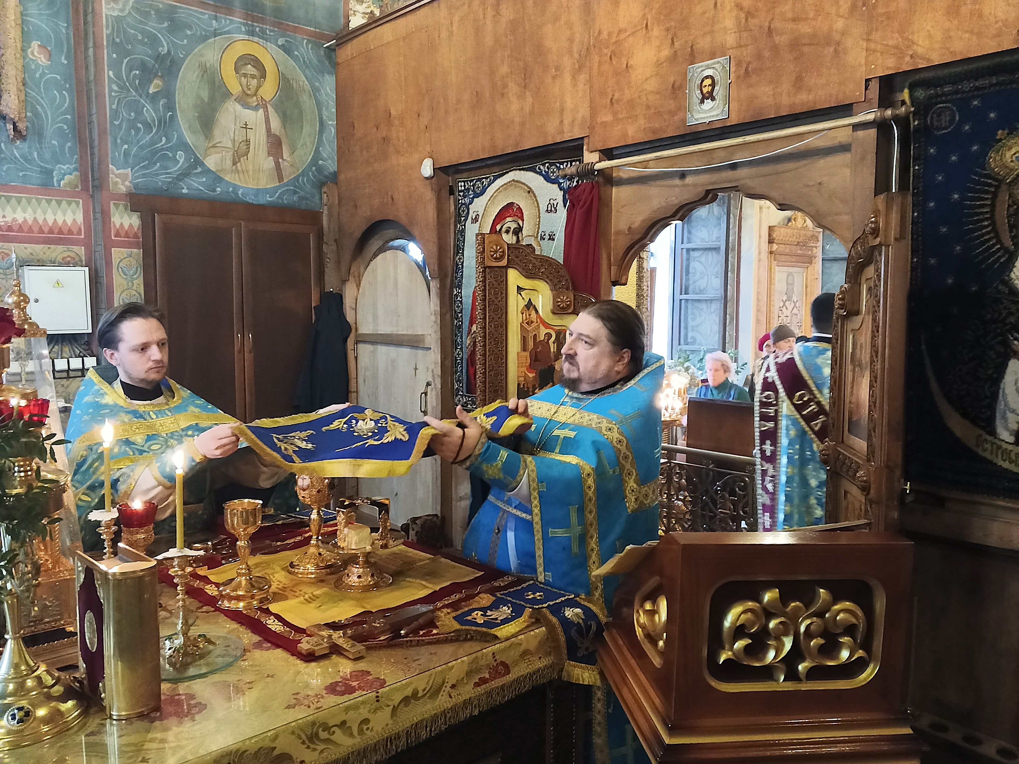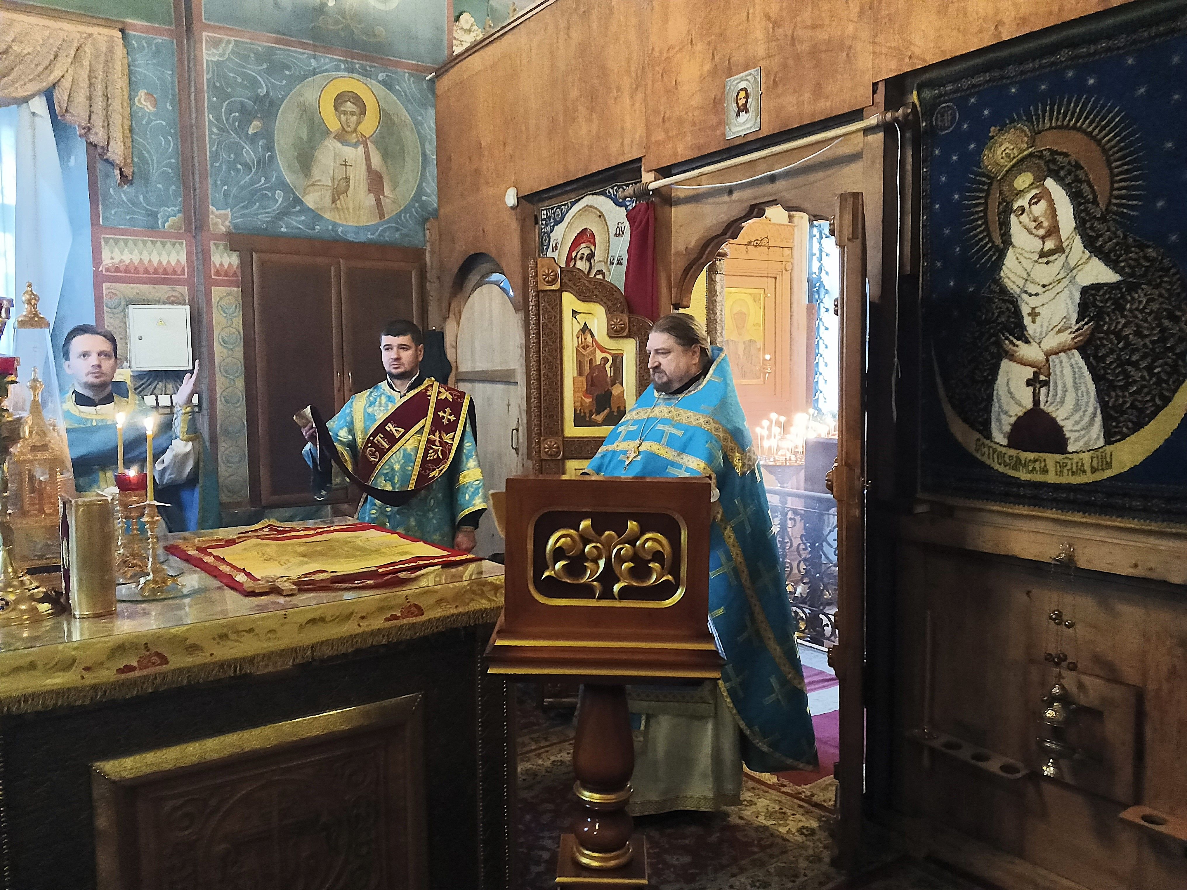 По отпусте литургии был совершен праздничный молебен пред иконой Покрова Пресвятой Богородицы и отец настоятель произнёс проповедь.