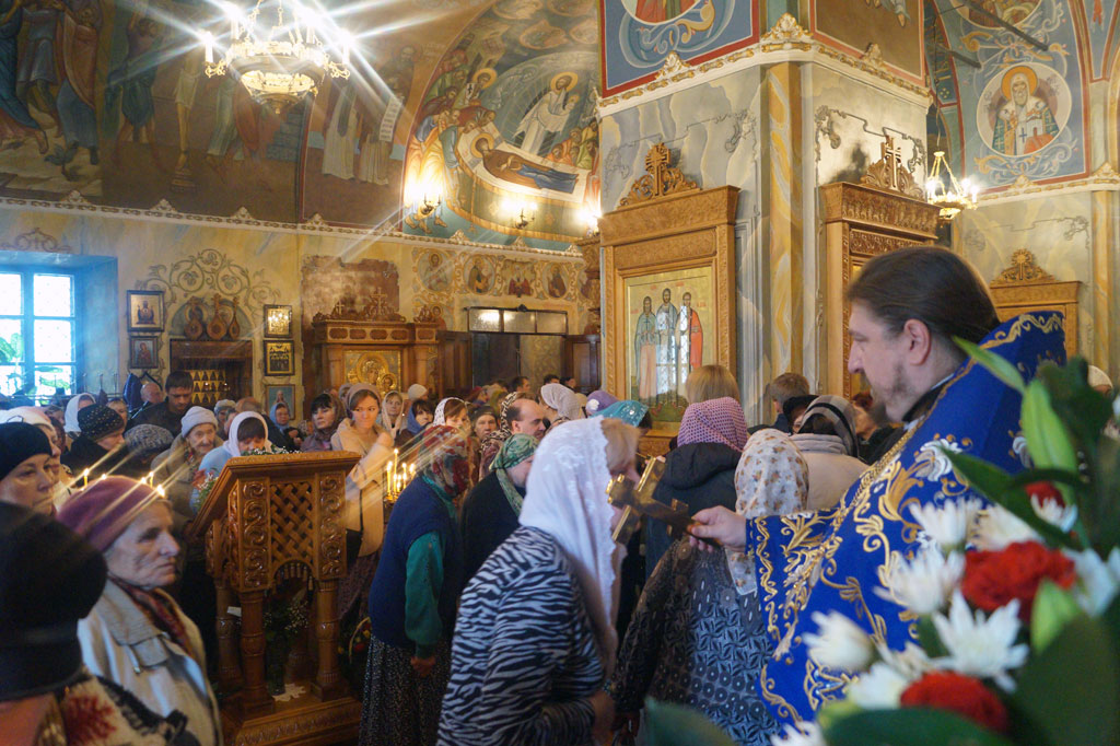 В 9 часов Божественную литургию совершал настоятель храма игумен Мефодий (Пронькин) в сослужении иерея Александра Беляева и протодиакона Василия Савельева. По сугубой ектении Духовенство вознесло молитвы о воцарении мира на Украине. Завершилась литургия молебным пением Пресвятой Владычице, затем отец настоятель обратился к верующим со словами благовестия.