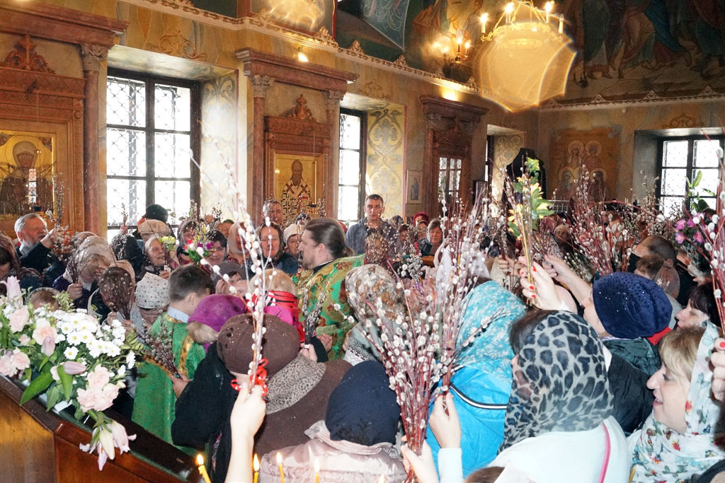 В 9 часов утра, позднюю Божественную литургию совершил настоятель храма, секретарь Калужской епархии, игумен Мефодий (Пронькин), сослужили ему иерей Александр Беляев и протодиакон Василий Савельев. Исповедь совершали иерей Евгений Холявко и иерей Павел Степанюк. Настоятелем произносилась молитва о мире на Украинской земле. Святых Христовых Тайн причастилось 250 прихожан. После праздничного отпуста было совершено окропление верб молящихся и настоятель обратился к собравшимся с проповедью.
