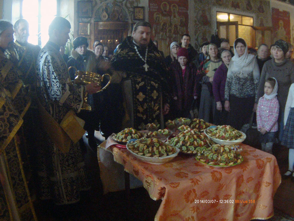 После заамвонной молитвы, духовенство вышло на центр храме, где заранее был приготовлен стол с "коливом". Каждый год Православная Церковь вспоминает чудо святого великомученника Феодора, когда он явившись уберег христиан от коварства Юлиана Отступника. Был прочитан канон святому мученику и с молитвой окроплено коливо и молящиеся.