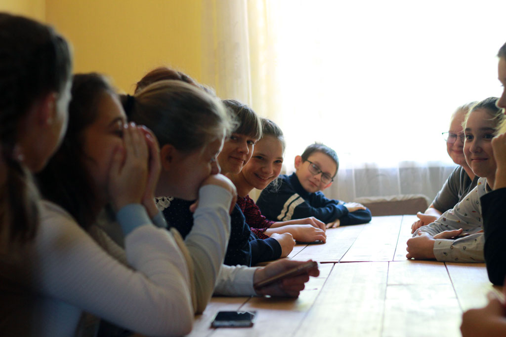 В другом классе, по расписанию - «новички», которые уже охотно общаются, часто перебивая друг-друга, знакомятся с помощью игр и разговор ведётся о Святых именах и именинах...