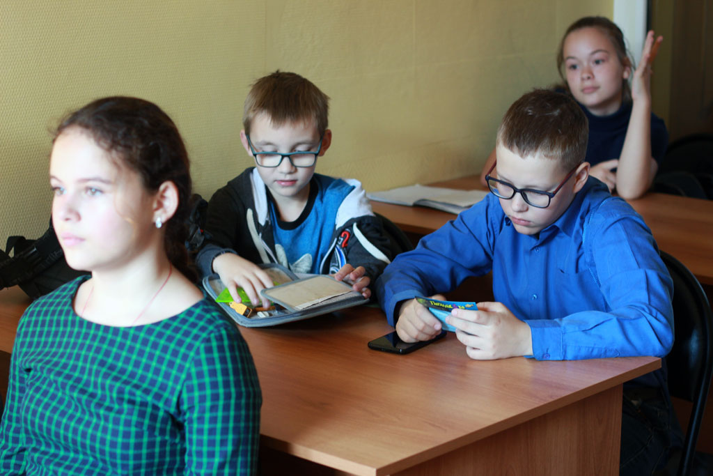 В следующем классе самая шумная и любознательная прошлогодняя группа... Речь идёт о Таинствах Православной Церкви, и ребята, которые хотят разгадать тайну, внимательно слушают, боятся что-либо пропустить...