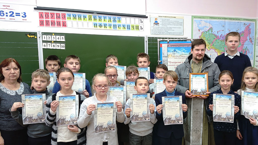 Совершив краткую молитву, юнных участников и их учителей священник окропил святой водой, призвав благословение Святого Духа на столь важное дело. Затем состоялось вручение грамот и сертификатов за участие в предварительном школьном туре олимпиады, проходившем 7 ноября.