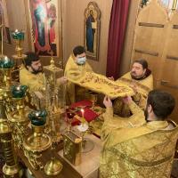 3 мая, Светлая Седмица, Светлый понедельник в храме святого пророка Иоанна Предтечи в Калуге начался с соборного богослужения - Божественную литургию совершил игумен Мефодий (Пронькин), настоятель храма, секретарь Калужской епархии, в сослужении протоиерея Максима Немыченкова, иерея Александра Беляева, иерея Павла Рогожина, иерея Павла Степанюка и диакона Вячеслава Бахаева.