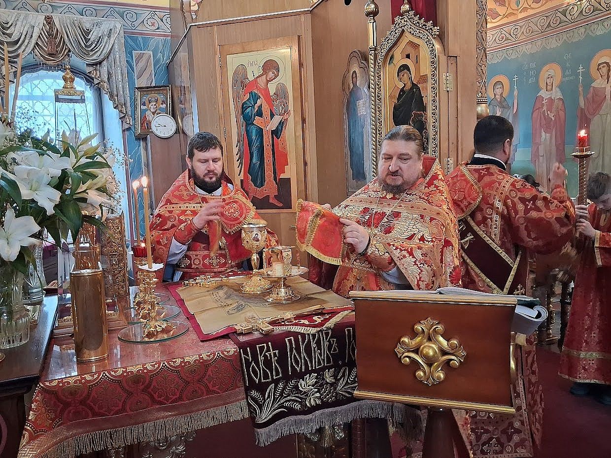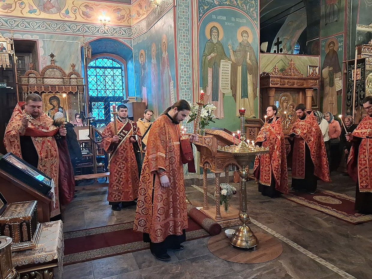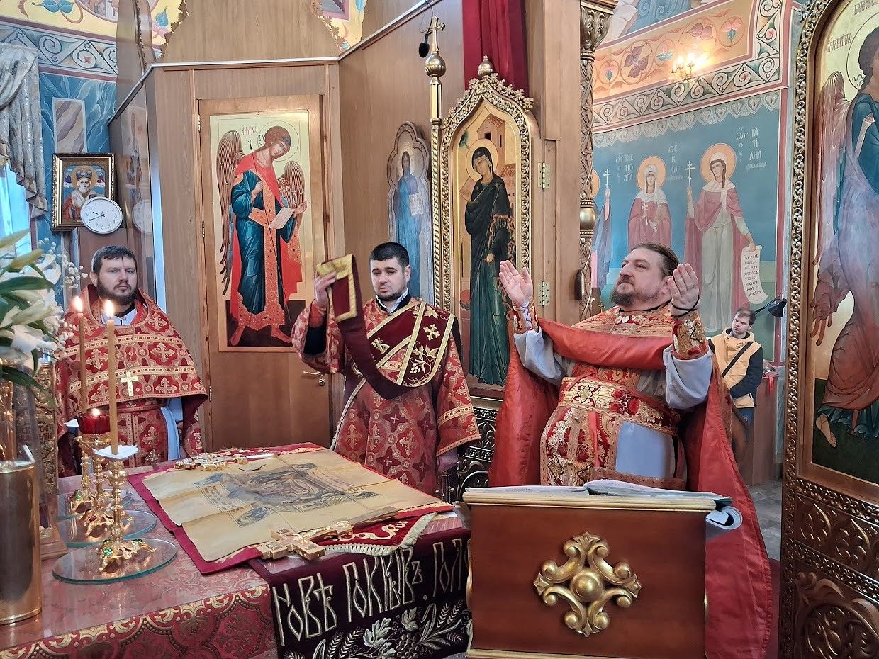 Позднюю литургию в центральном пределе, совершил настоятель храма игумен Мефодий (Пронькин), сослужили ему иерей Александр Беляев и диакон Виктор Староста.