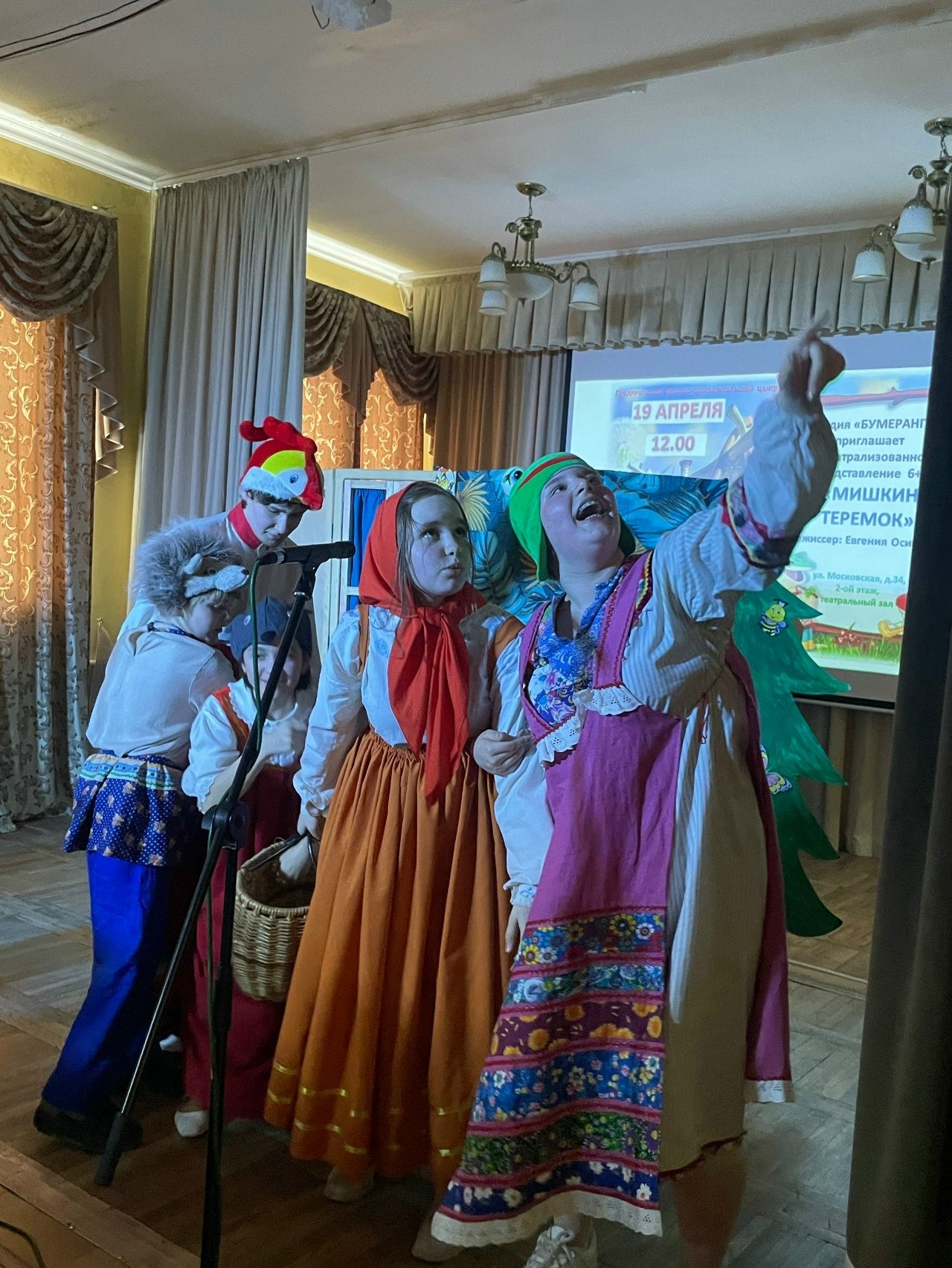 После совместно-исполненного тропаря Пасхи, началось театрализованное представление «Мишкин теремок», разыгранное студией «Бумеранг» воскресной школы (педагог Е.Е.Осипова).