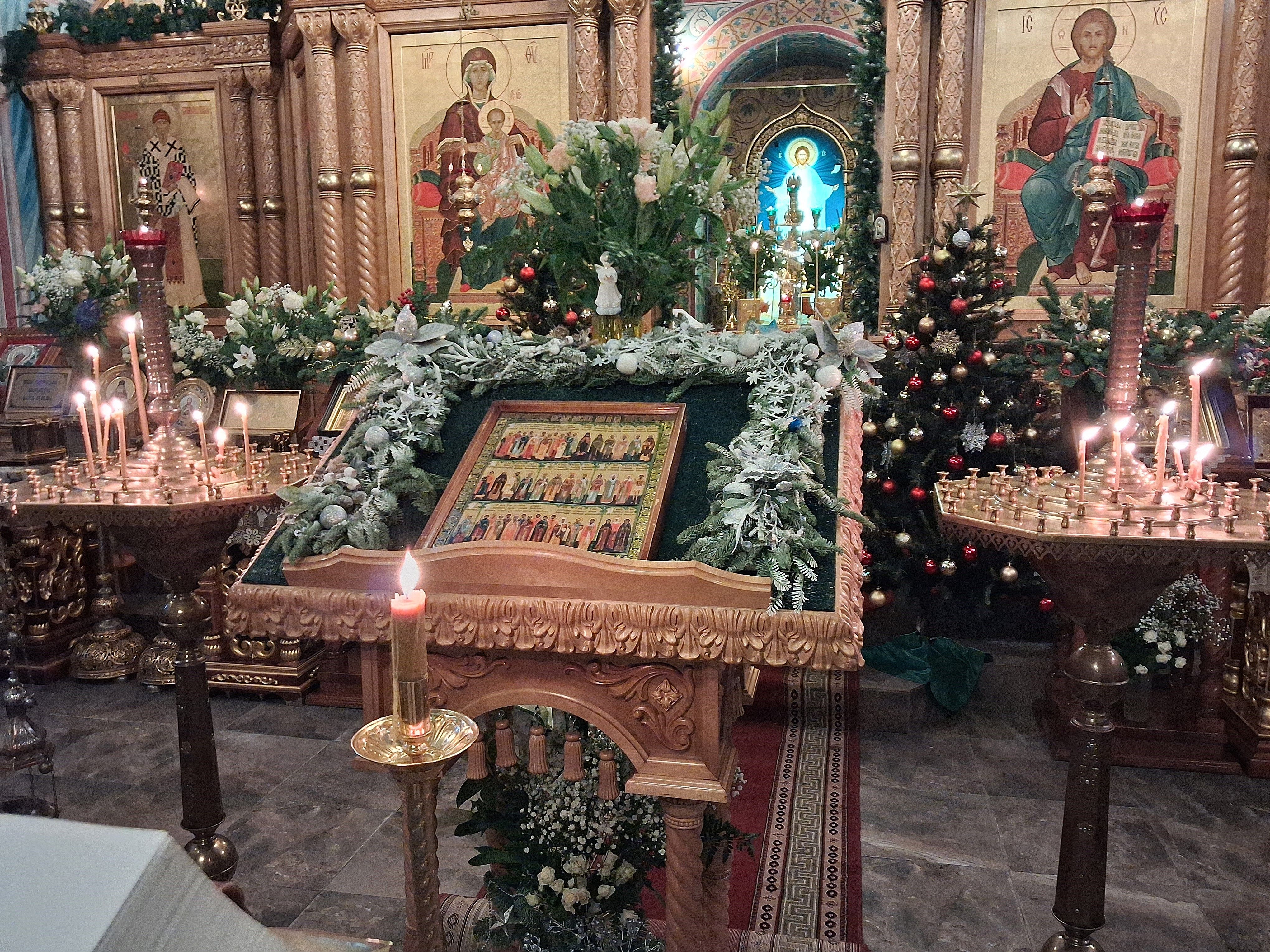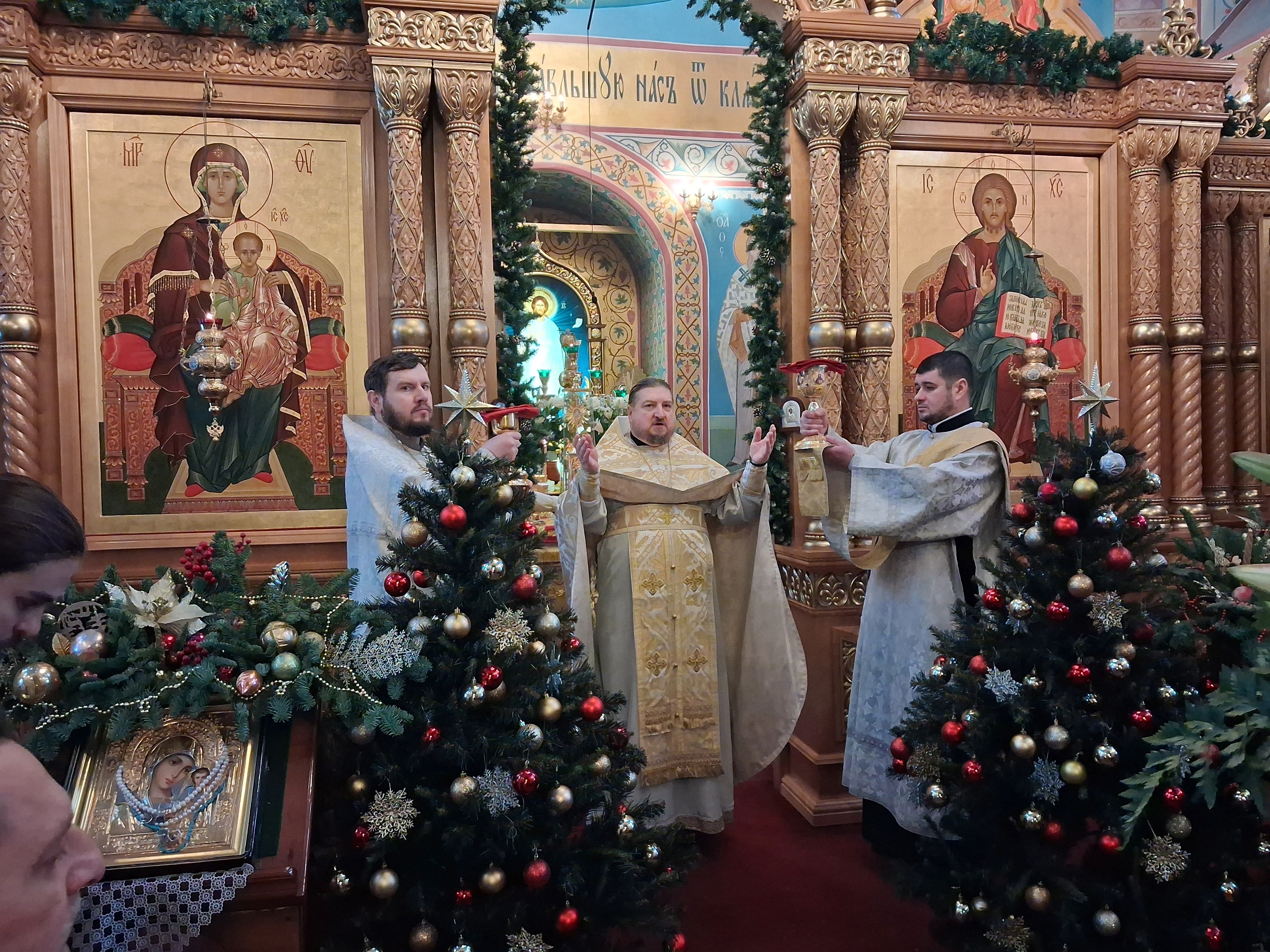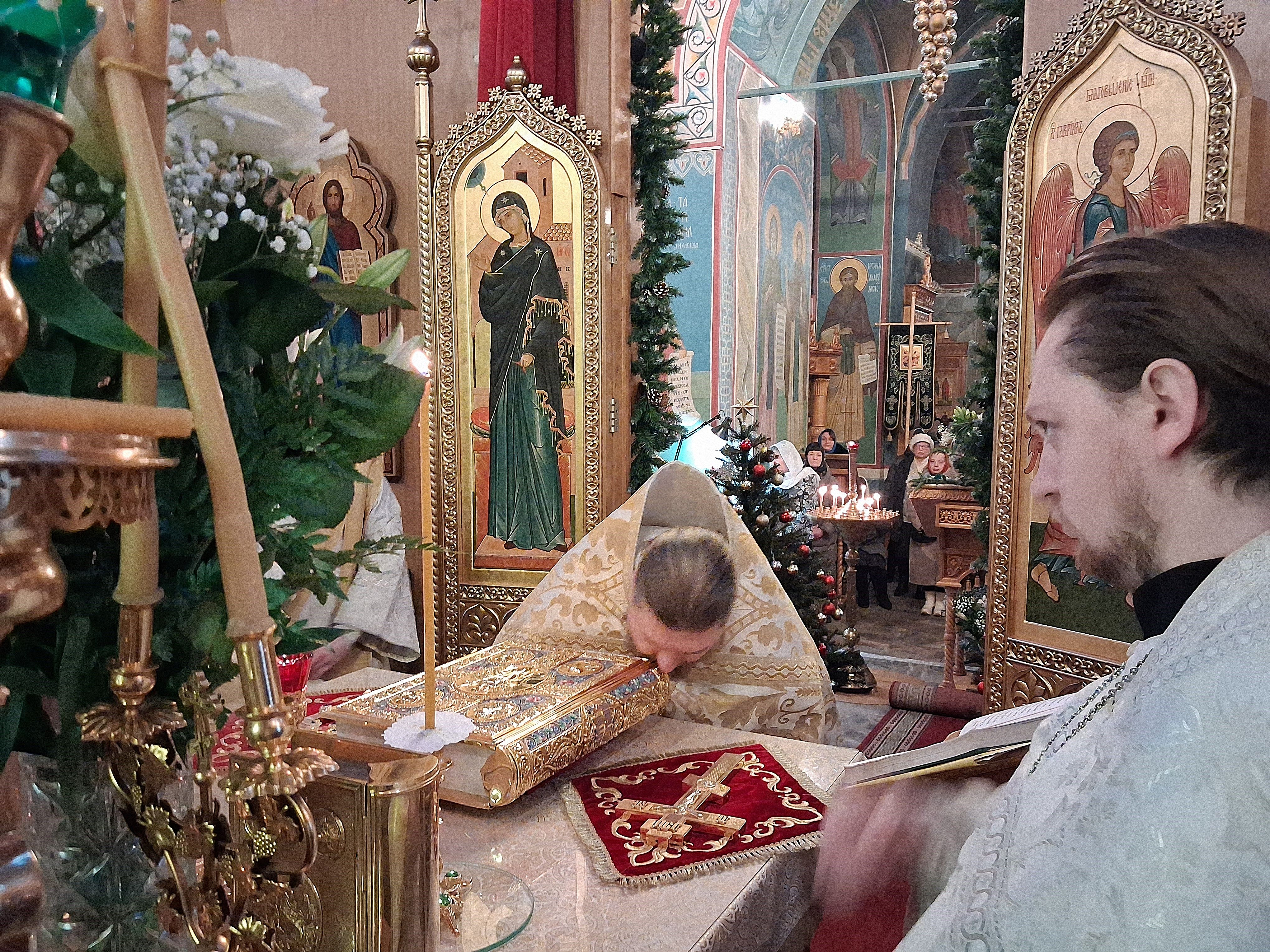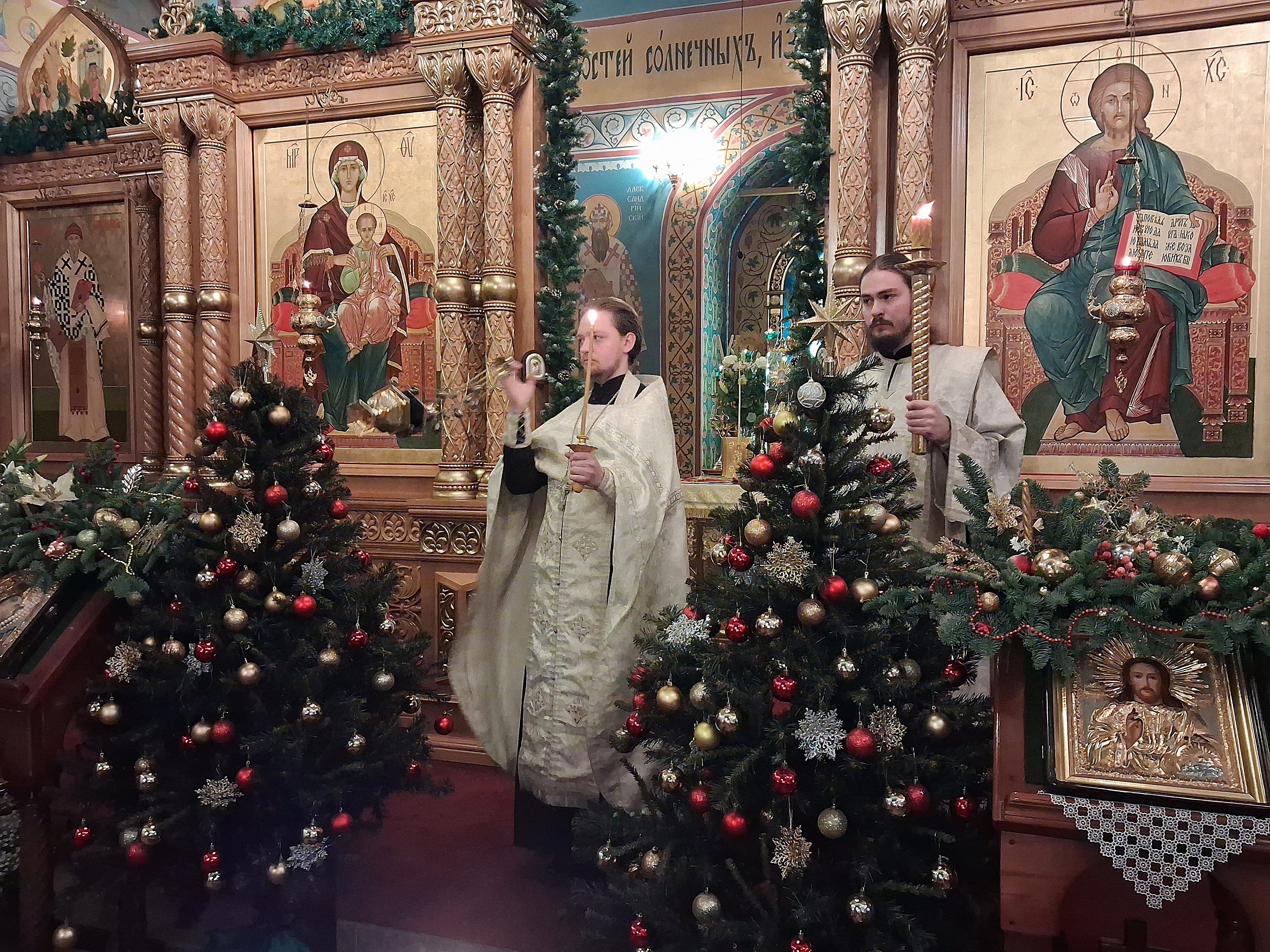 По отпусте литургии перед возженной свечей в центре храма были пропеты тропарь и кондак праздника Рождества Христова.
