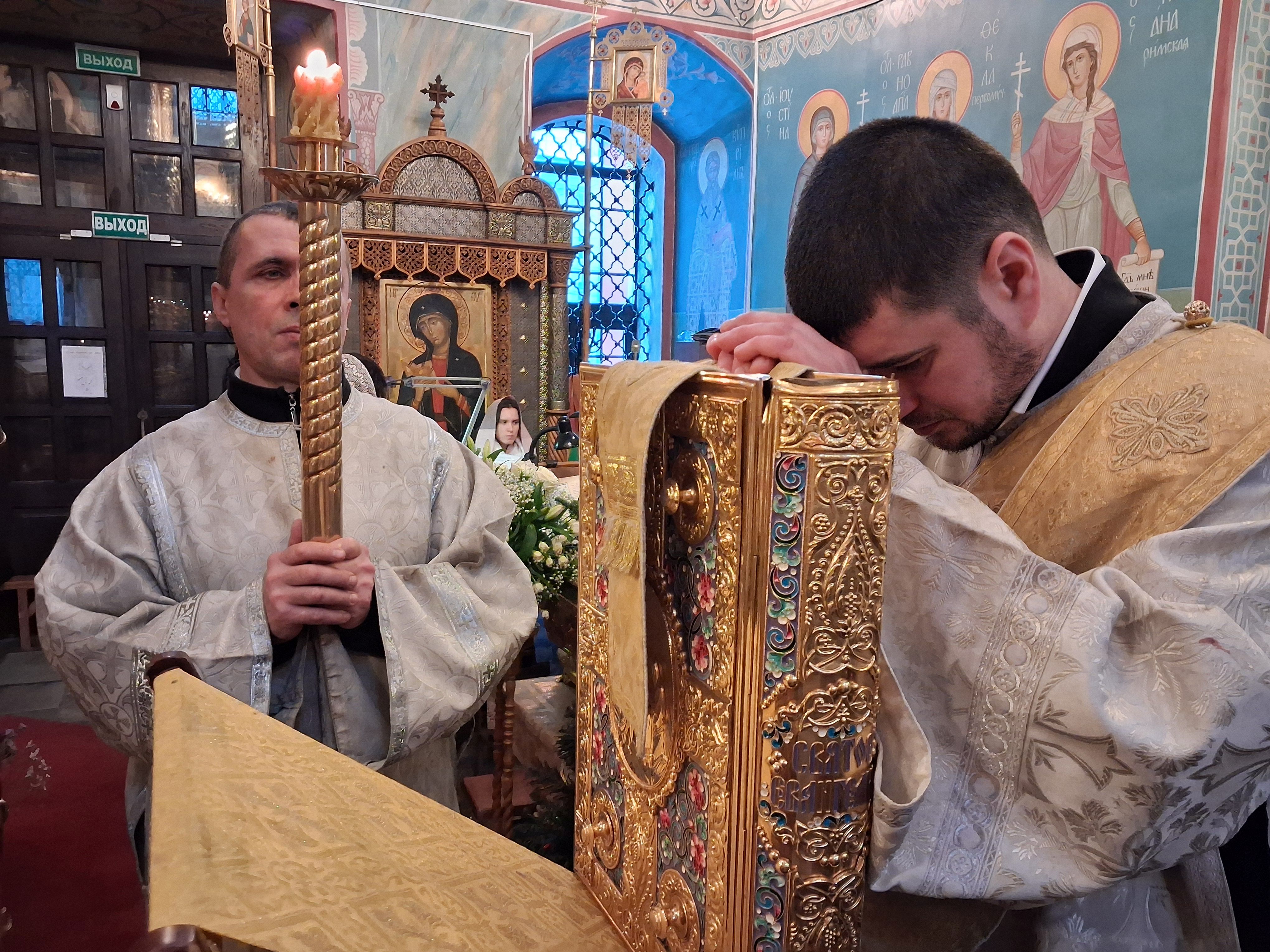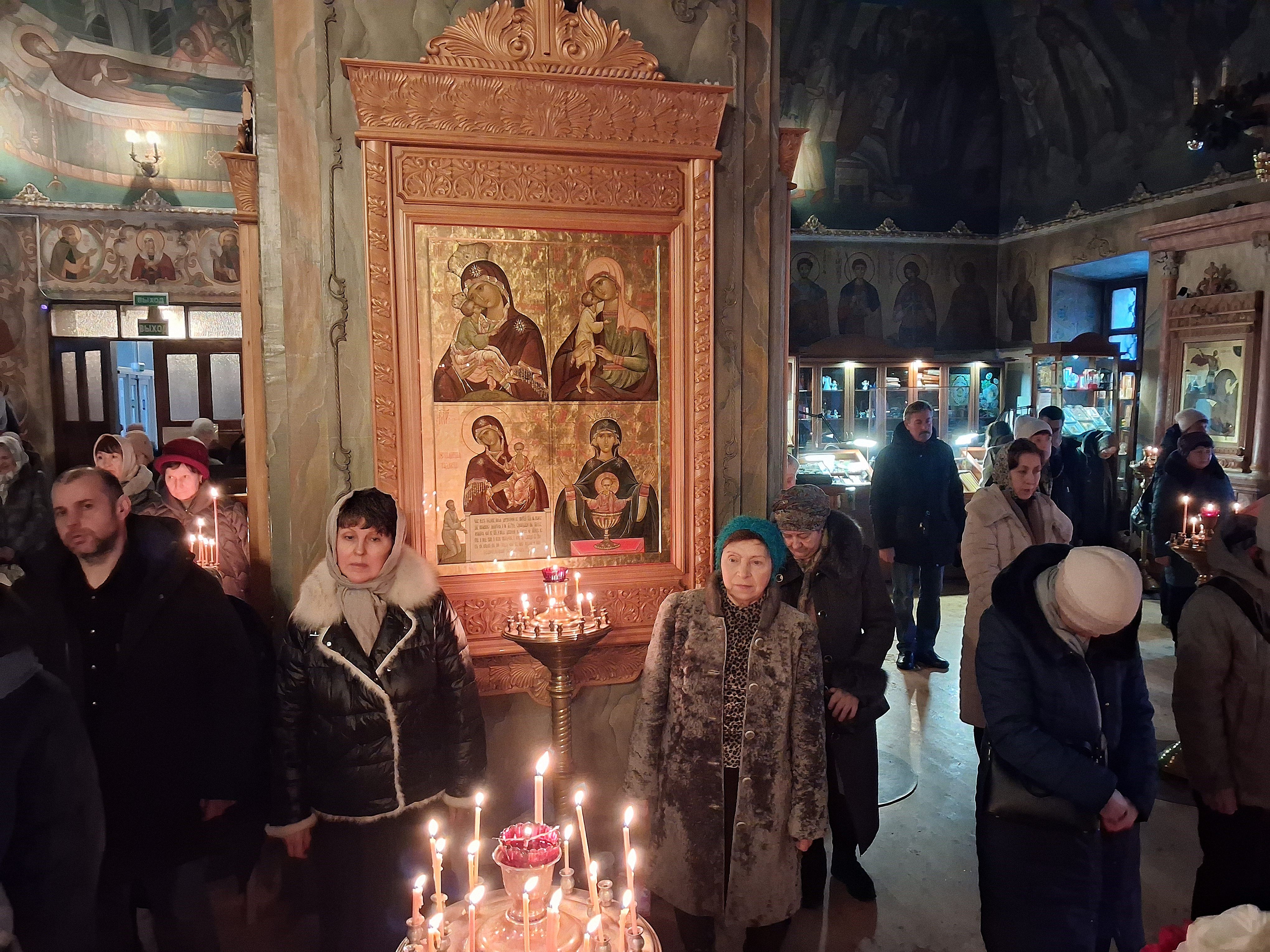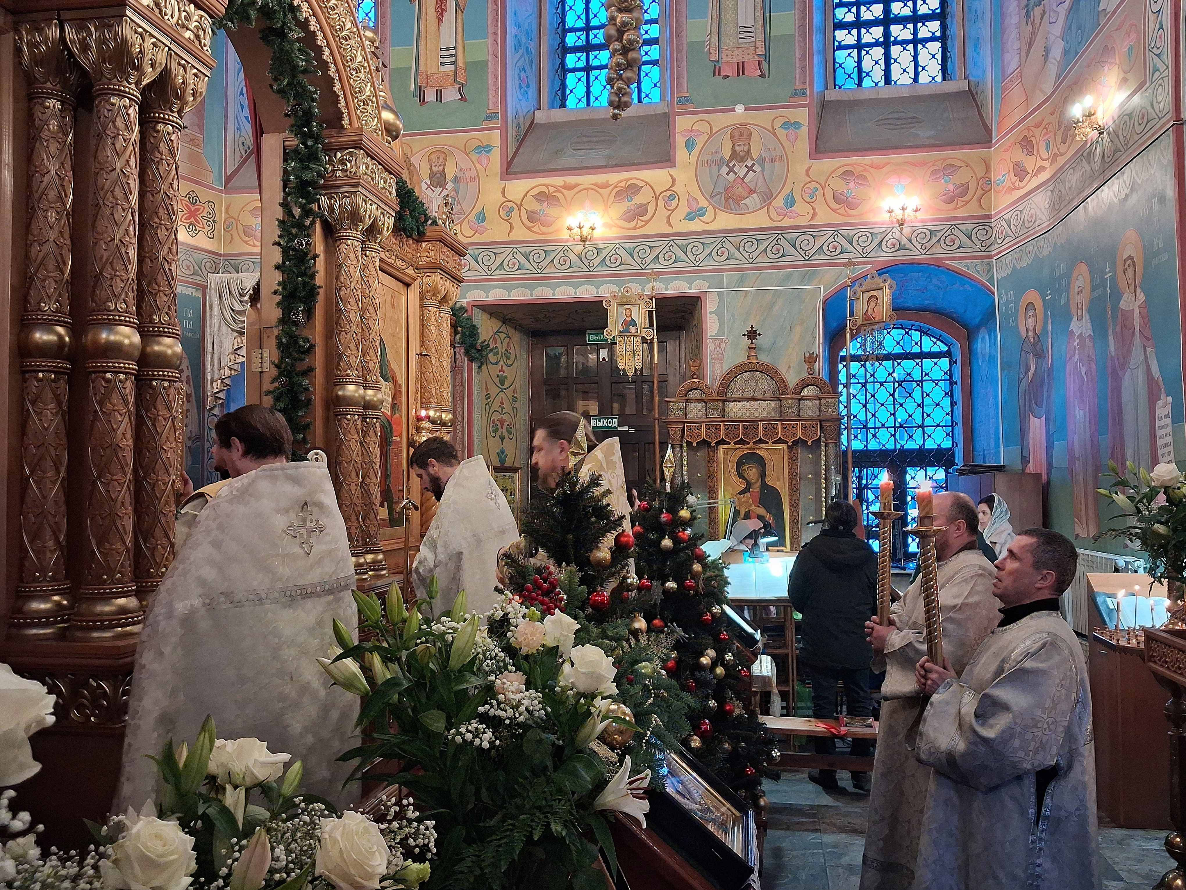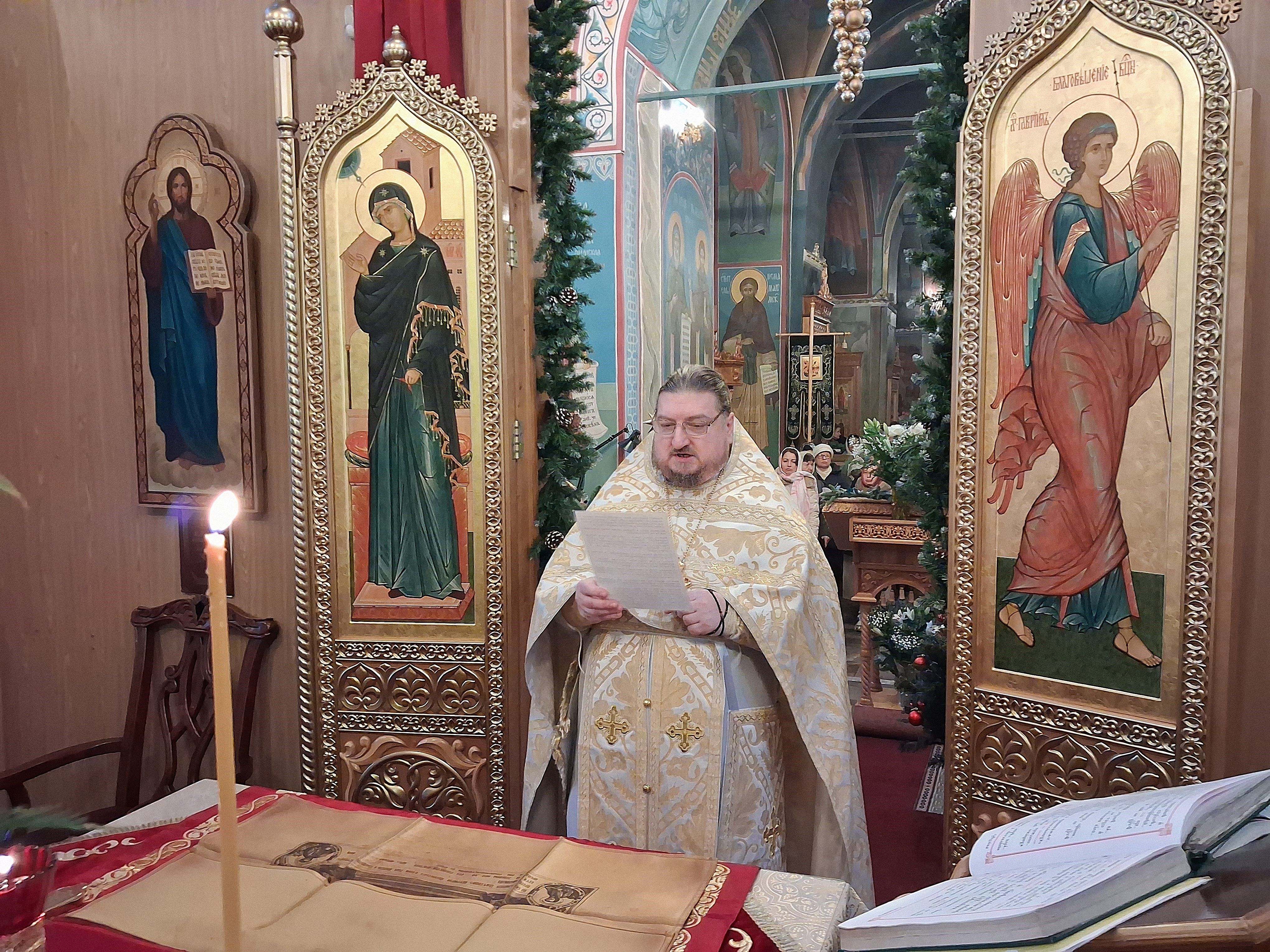 По отпусте литургии перед возженной свечей в центре храма были пропеты тропарь и кондак праздника Рождества Христова.