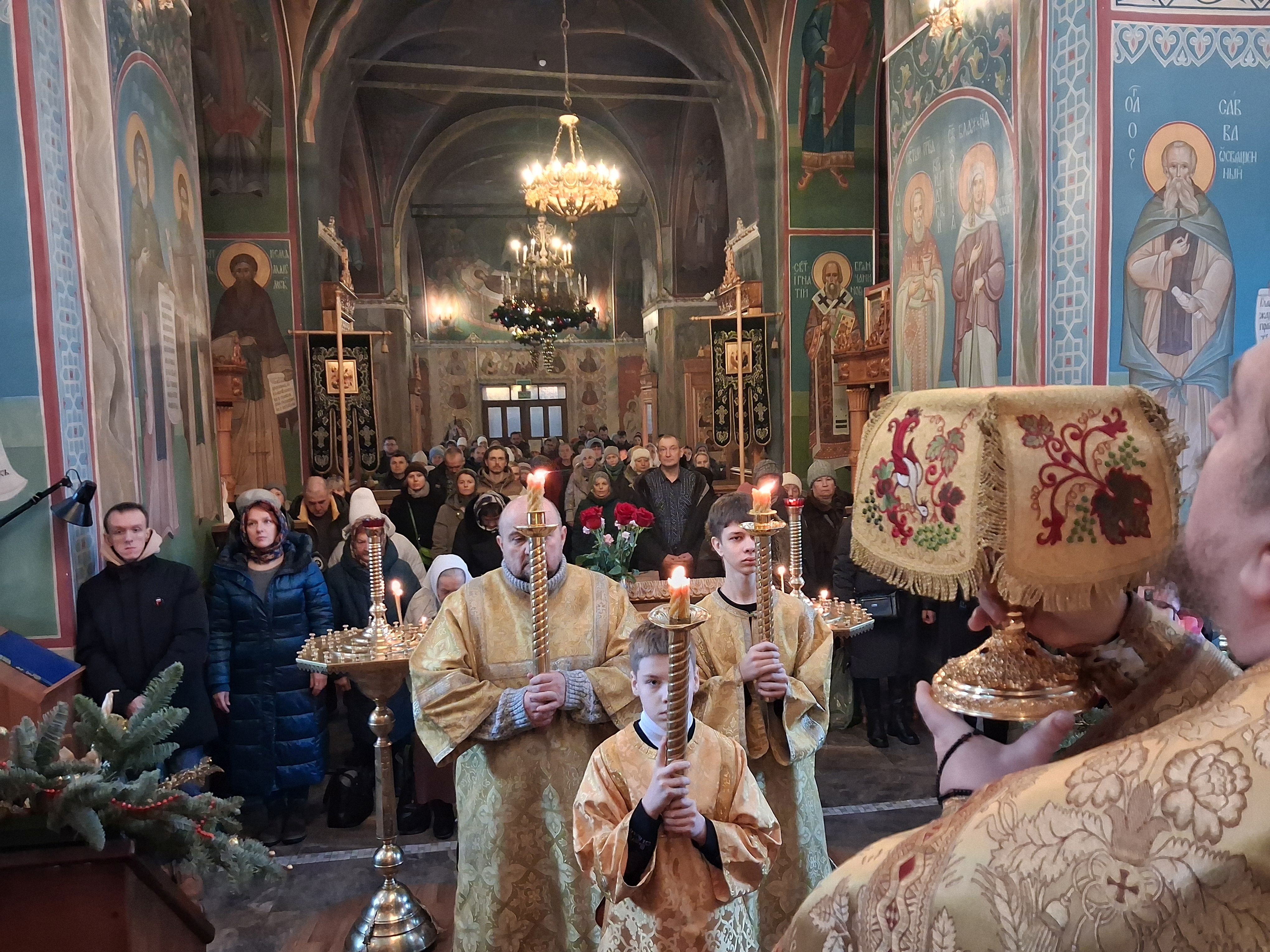 Позднюю литургию, в центральном пределе, совершил игумен Мефодий (Пронькин), в сослужении иерея Александра Беляева и диакона Никиты Романовского.